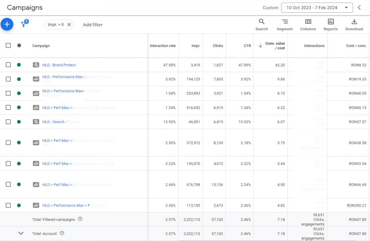Creșterea Conversion Value (valoarea vonversiilor) și a ROAS-ului: Conversion Value a crescut cu 26%, iar Return on Advertising Spend (ROAS) a crescut cu 22.06%. Aceste creșteri indică o mai mare valoare generată de campaniile de publicitate și o rentabilitate îmbunătățită a investițiilor.