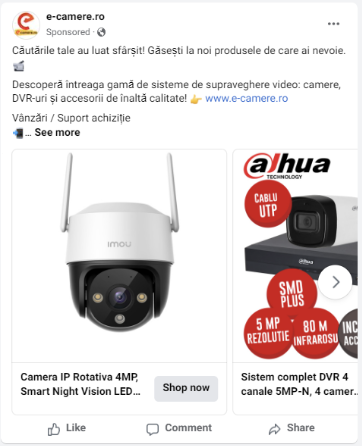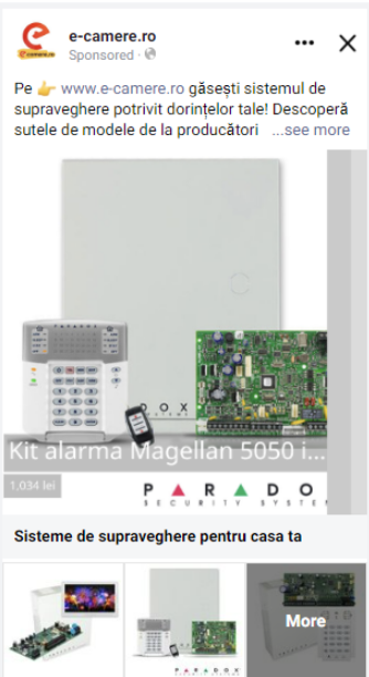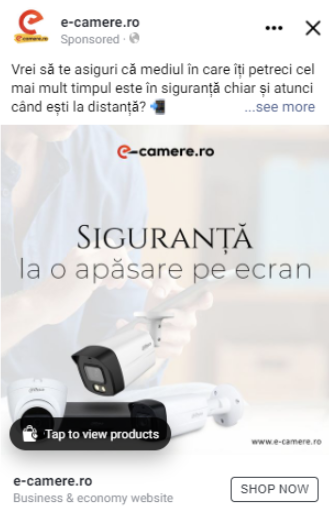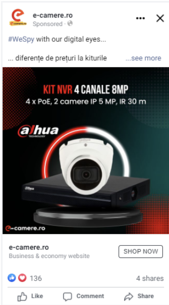 În primă fază, am decis crearea unei campanii de engagement, ca etapă inițială în crearea unui funnel complet. Pentru această campanie, am folosit o audiență formată din persoane cu vârste între 25-55 ani, interesate de tehnologii smart, gadgeturi și sisteme de supraveghere. Ca și componentă vizuală, s-au selectat câteva postări puse inițial în pagină.