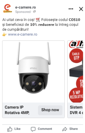 Pentru orice afacere, este foarte important să retargetezi persoanele care au arătat un interes pentru produsele vândute. Astfel, crearea unei campanii de retargetare pentru persoanele care au văzut produse de pe site sau le-au adăugat în coș a fost un pas firesc. Această campanie aduce rezultate bune constant, fiind de cele mai multe ori imboldul necesar pentru ca persoanele interesate de produsele de pe site să recurgă la finalizarea comenzii.